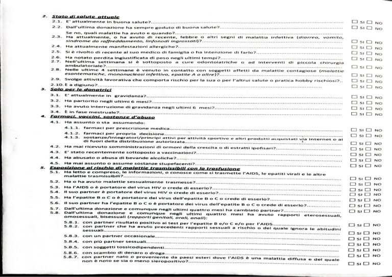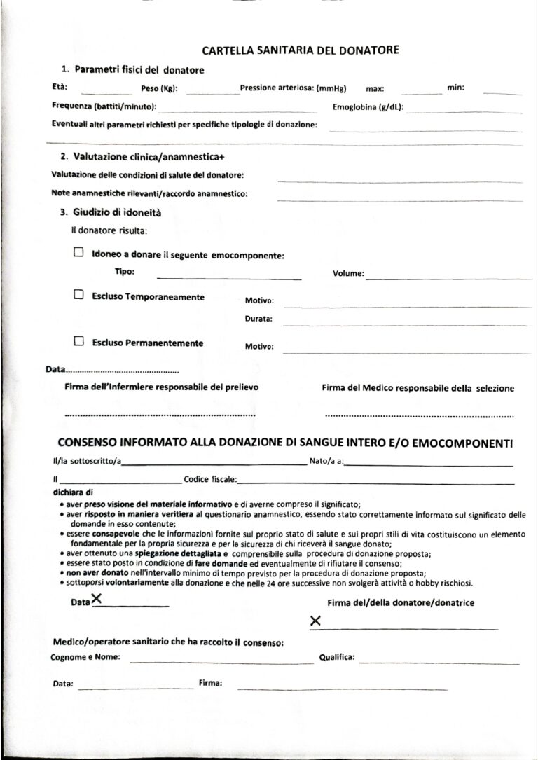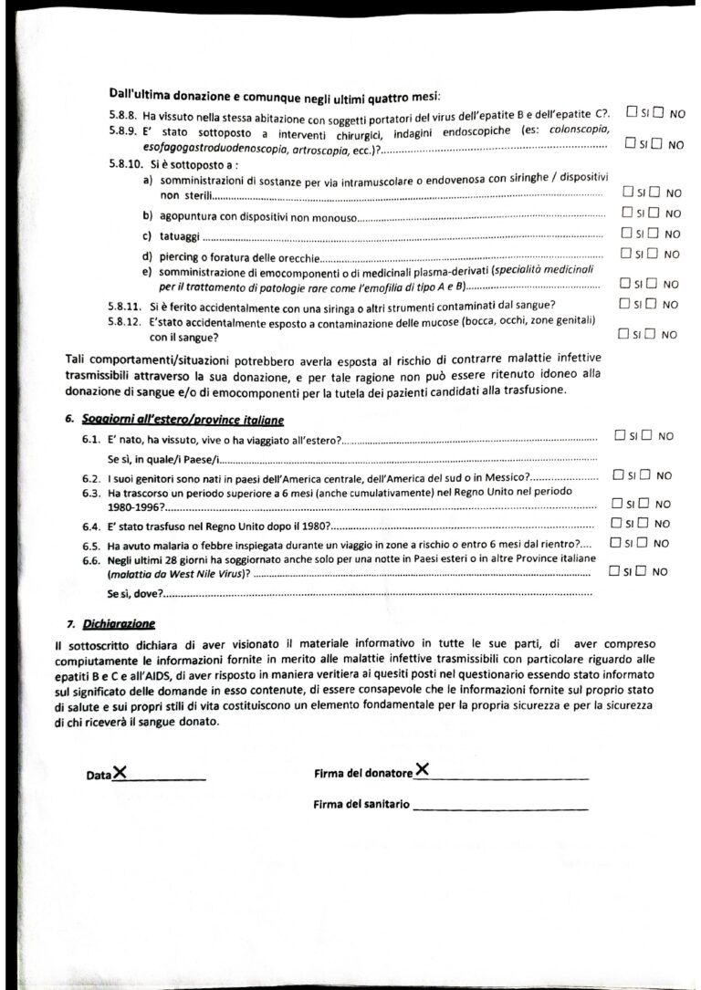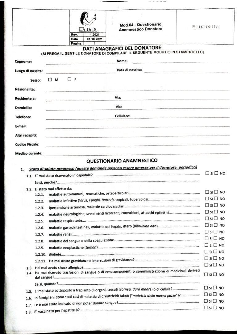 Mod .04 Questionario Anamnestico Donatore. Da riempire e firmare davanti ad un Medico /Operatore sanitario