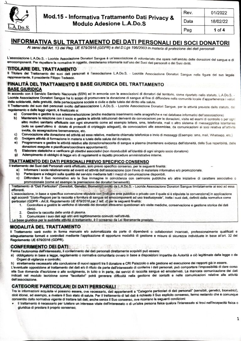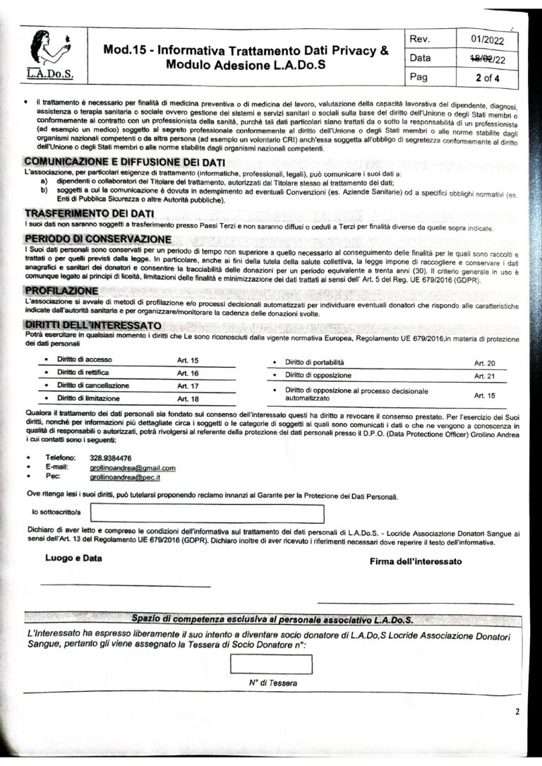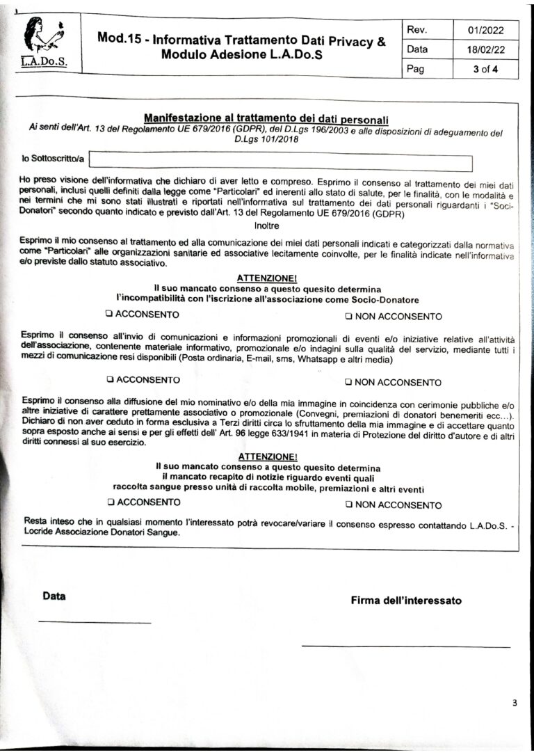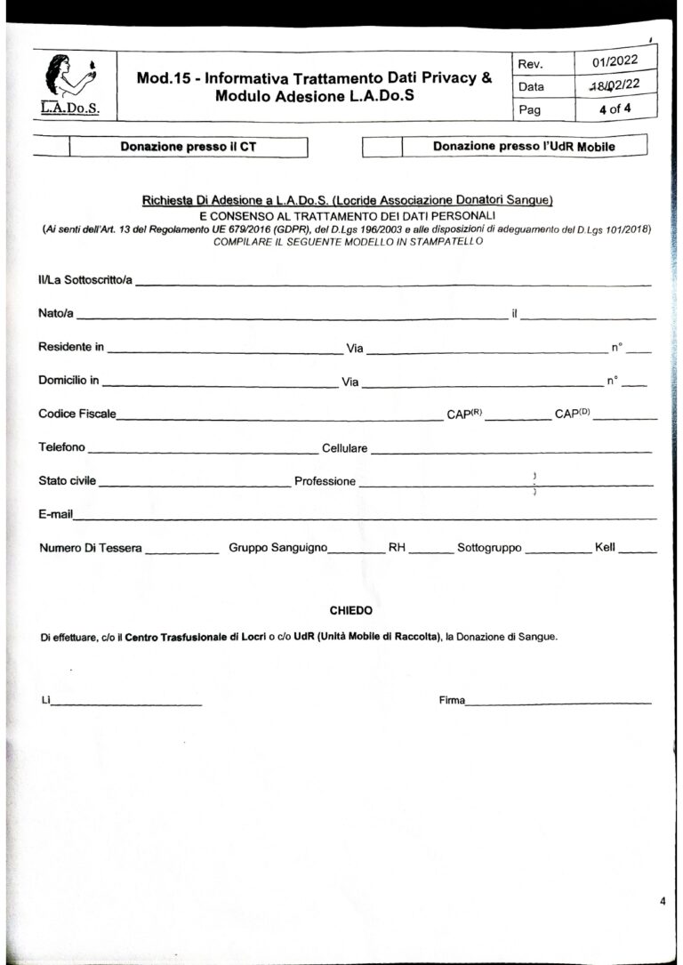 Mod .04 Questionario Anamnestico Donatore. Da riempire e firmare davanti ad un Medico /Operatore sanitario